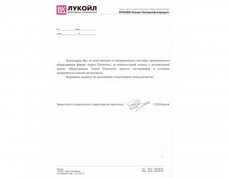 Благодарим Вас за качественную и своевременную поставку оборудования фирмы Aspect Electronics, за внимательный подход к поставленной задаче. Оборудование Aspect Electronics прошло тестирование и успешно применяется в нашей организации.