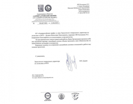 АО "Адмиралтейские верфи" в лице Заместителя генерального директора по логистике и МТО - Дудина Вячеслава Николаевича, выражает ИП Кузьменко Р.С. искреннюю благодарность за плодотворное сотрудничество.